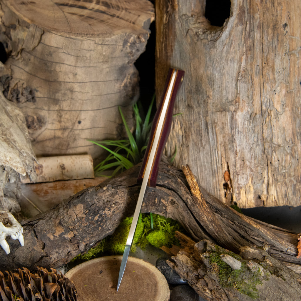 This knife was ground from 5/32nd A2 tool steel. It features a double red canvas micarta handle with natural canvas micarta liners and brass pins.