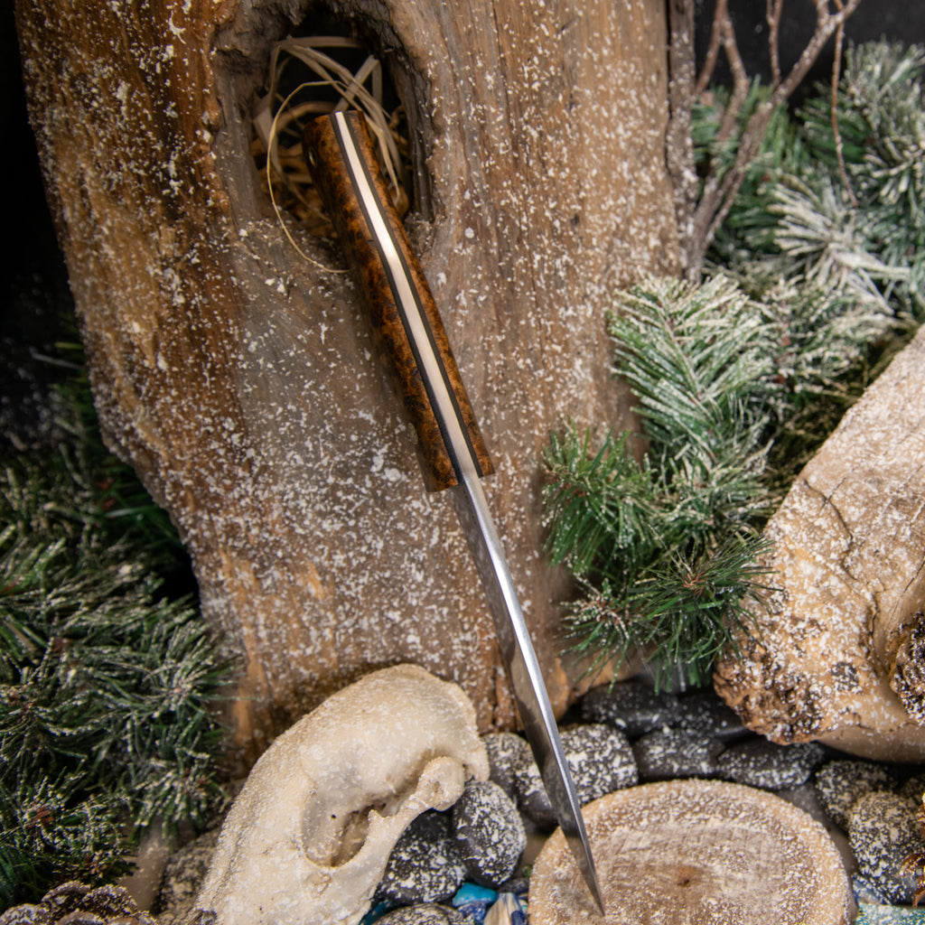 This knife was forged from 8670 high carbon steel. It features a Black Ash Burl handle with black canvas micarta liners and mosaic pins.