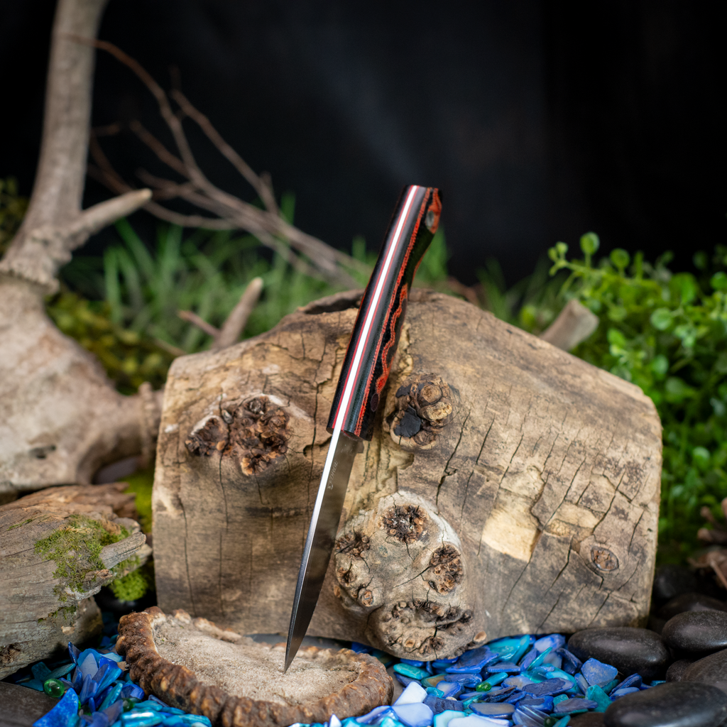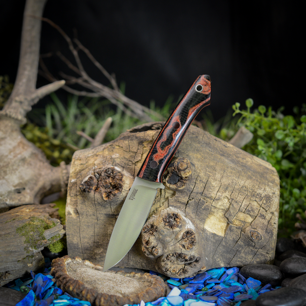 This knife was ground from 3/32nd AEB-L Stainless Steel. It features a Red and black Snakeskin micarta handle with red liners and red fiber optic pins.