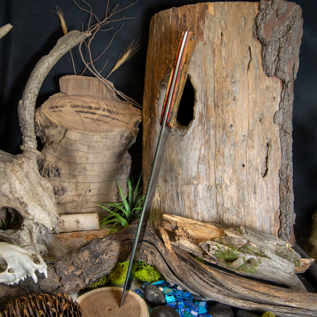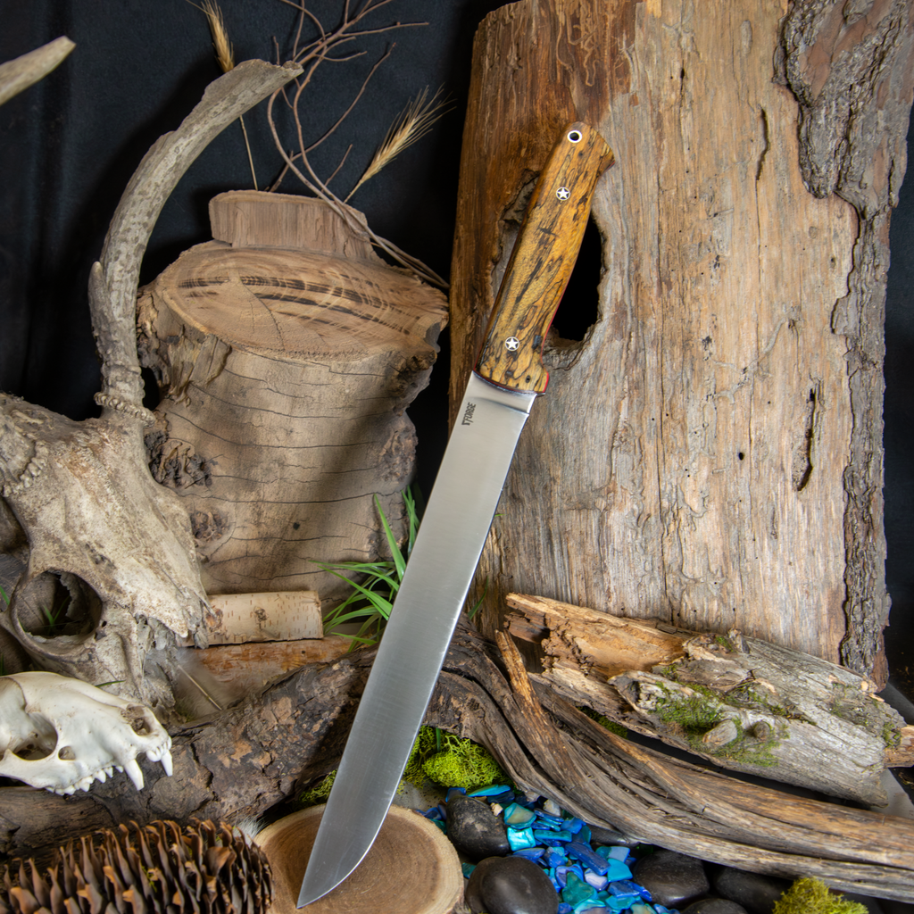 This camp chopper was forged from 8670 and features spalted tamarind with black canvas liners and red pin strips and star mosaic pins
