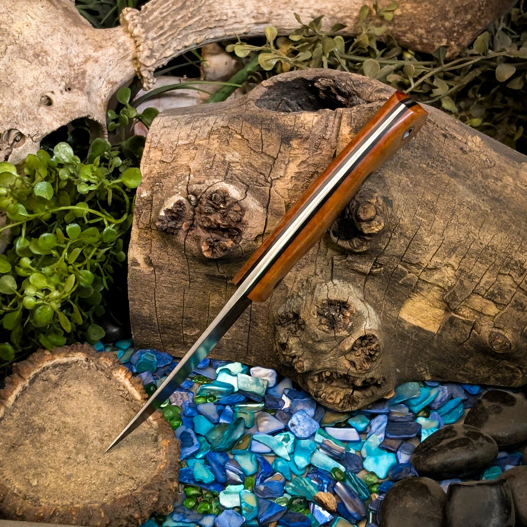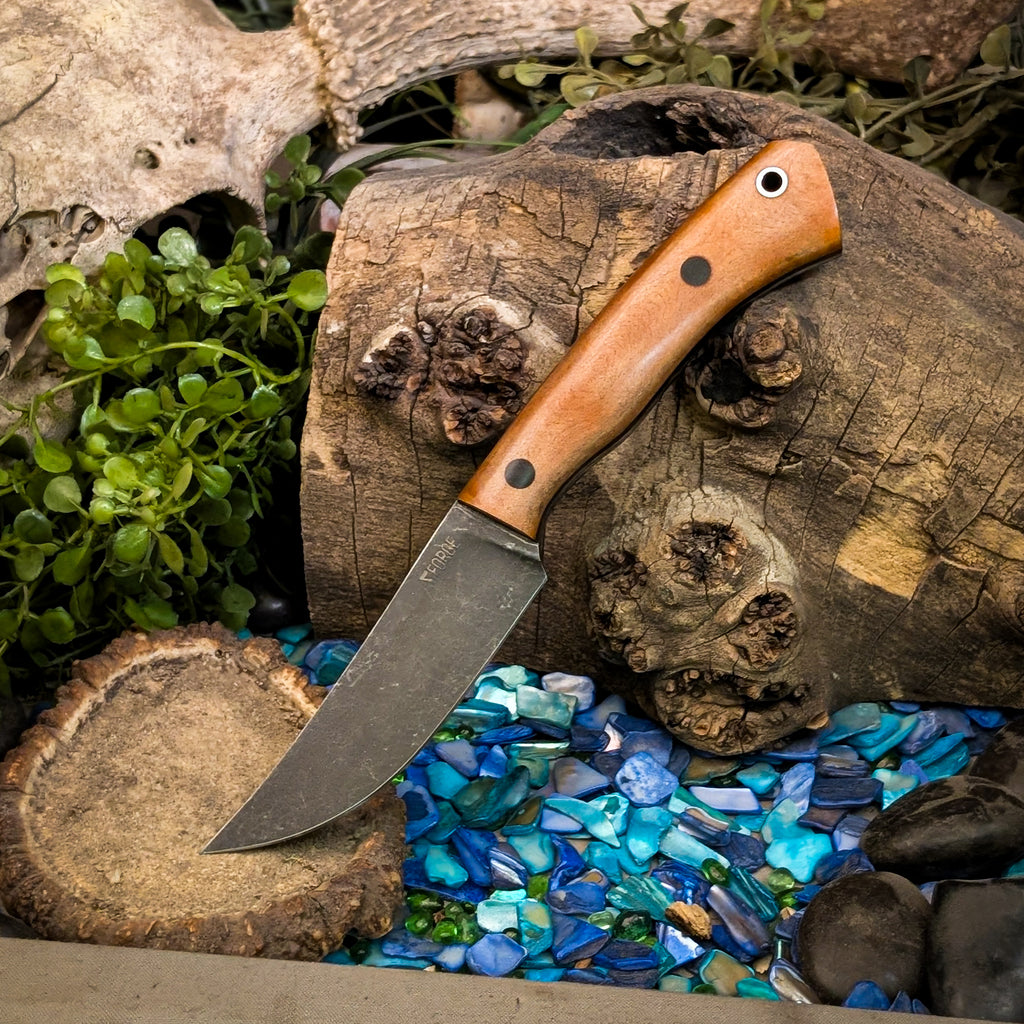 This knife was forged from 8670 high carbon steel. It features a natural Richlite handle with black canvas micarta liners and black pins. It also features a stone washed finish.