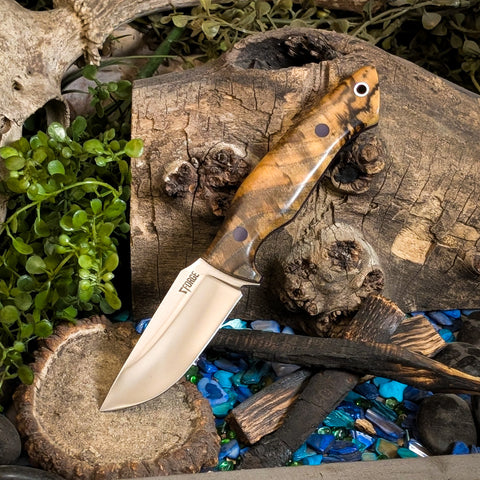 This Hermes was ground from 1/8 inch Procut high carbon steel. It features a spalted hackberry handle with purple g10 liners and purple pins.