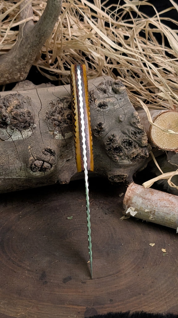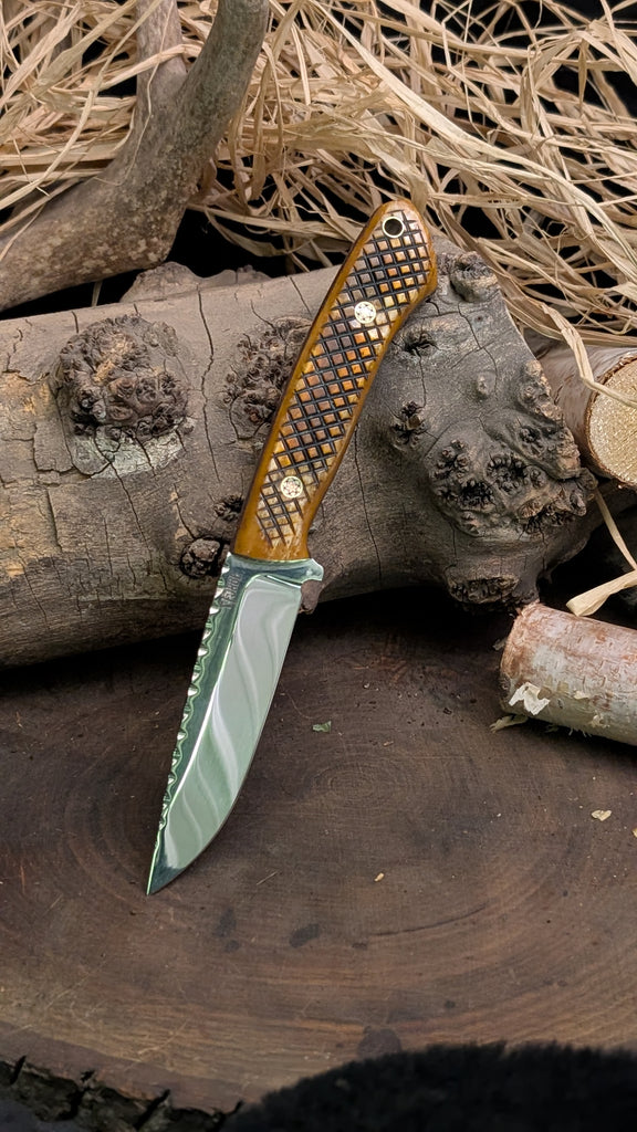 This praxis hunter was ground from 1/8 inch Nitro-V and features checked jigged bone with red burlap liners and mosaic pins