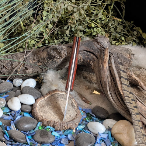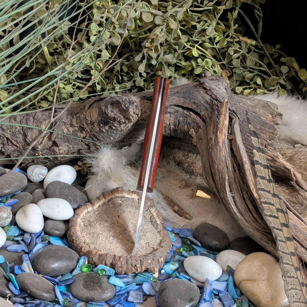 This knife was ground from 3/32nd AEB-L Stainless steel. It features a Red and Black Rag Micarta handle with black canvas micarta liners and black pins. It also features a 2 tone finish with copper washed bevels and black flats.