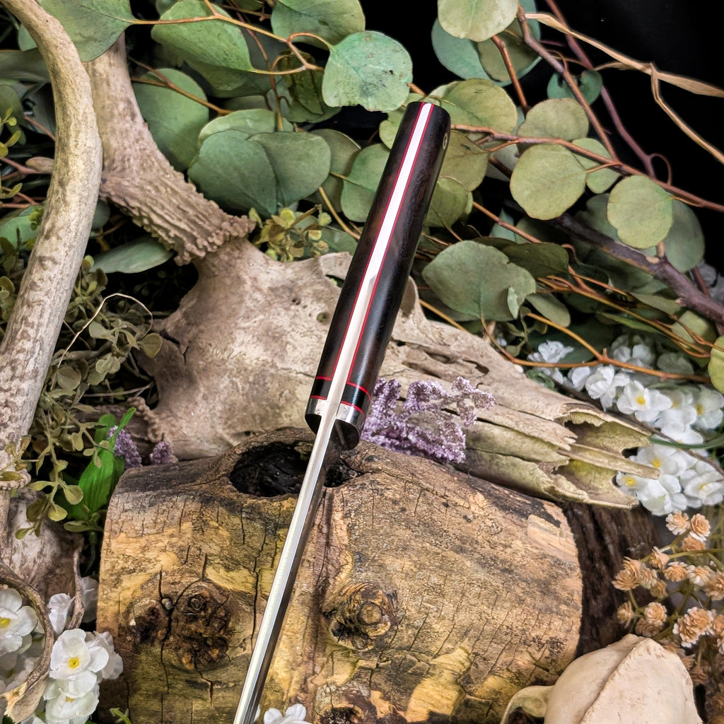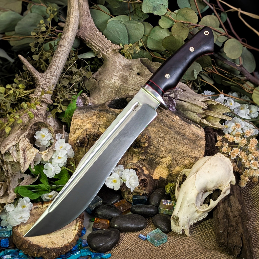 This revenant bowie was ground from 52100 High Carbon Steel. It features a Turkish walnut handle with a black canvas micarta spacer, red lienrs and mosaic pins.
