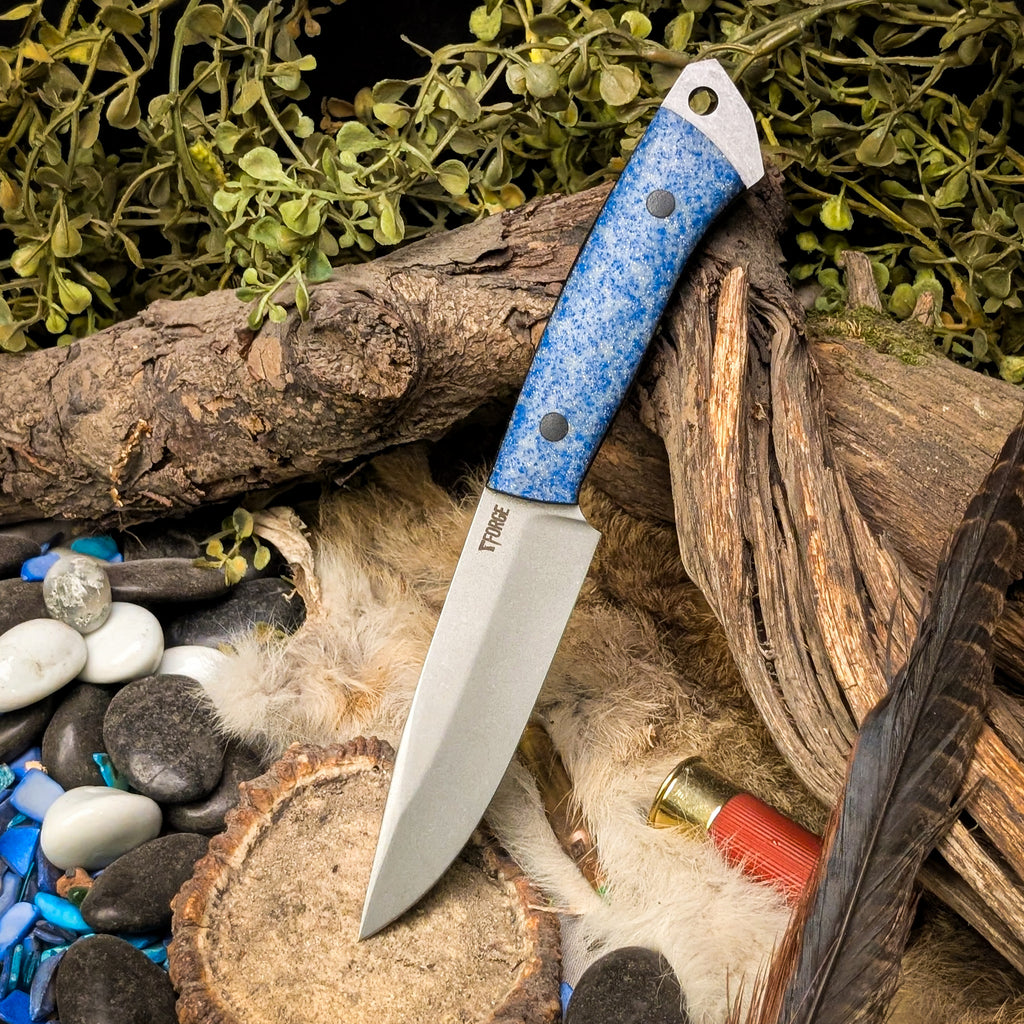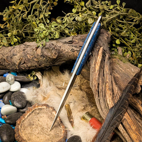 This knife was ground from Nitro-V Stainless steel. It features a frost Griptec handle with black canvas liners and pins.