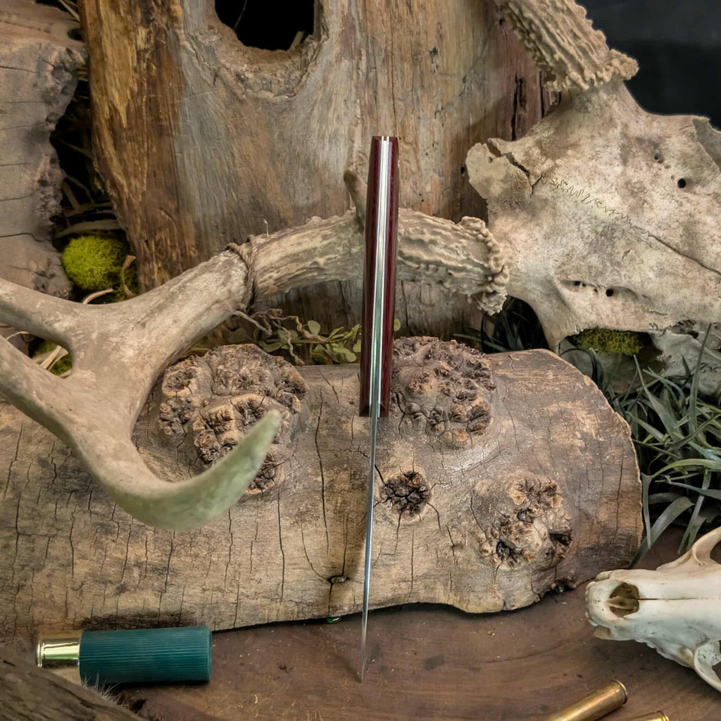 This spear point was ground from 1/8 inch nitro-v and features maroon linen micarta with white liners and aluminum pins.