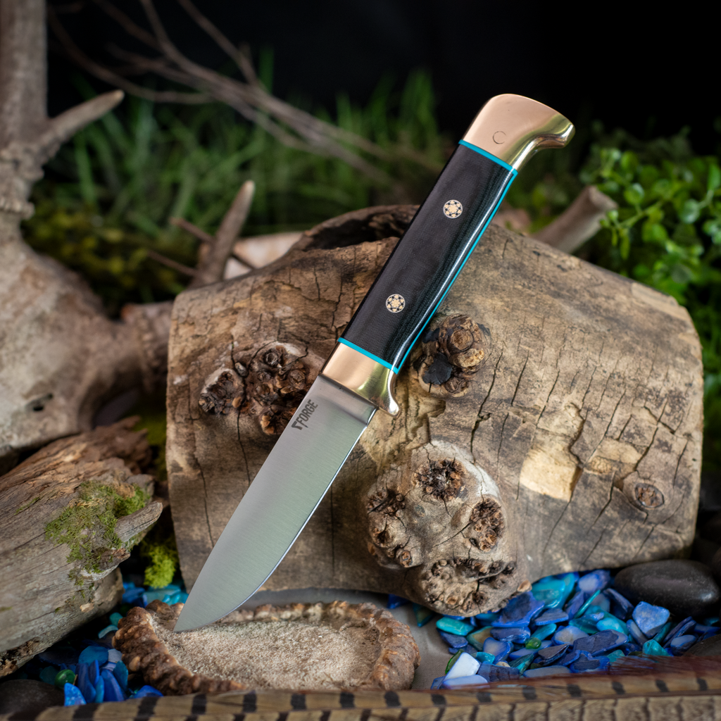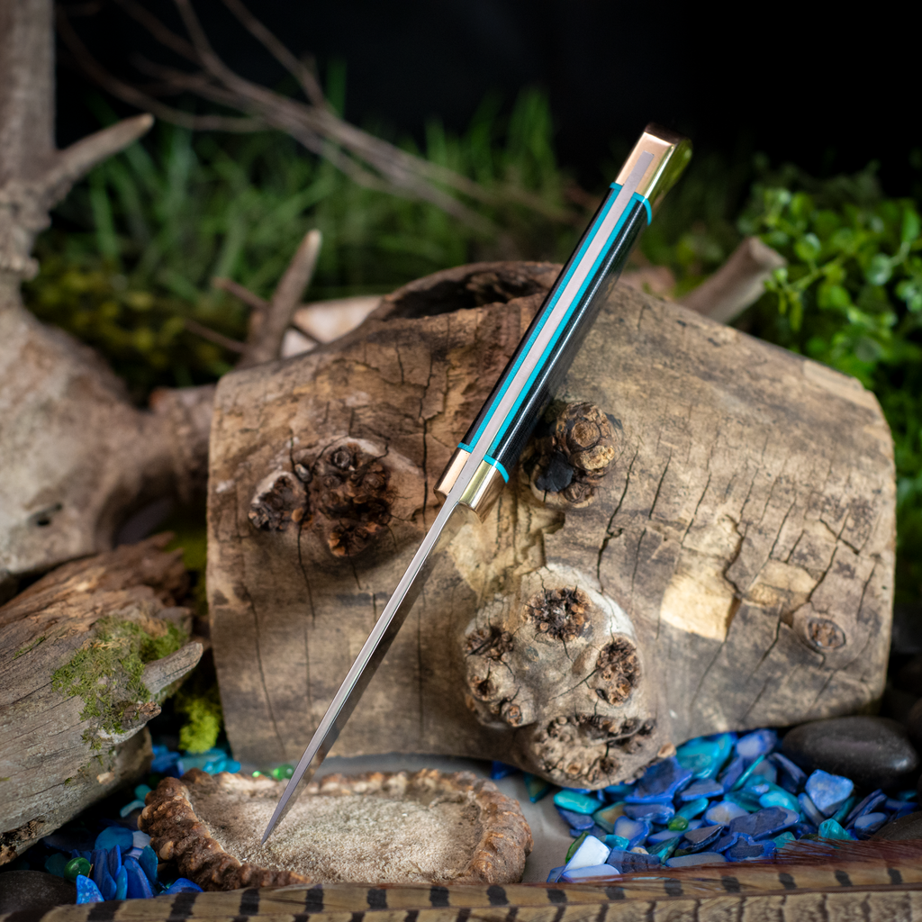 This midwesterner was ground from 80crv2 and features bronze guard and pommel with black linen micarta with turquoise liners and mosaic pins