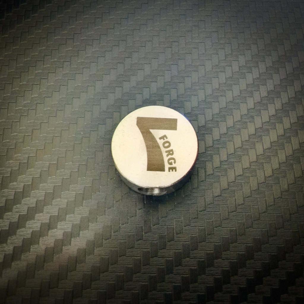 A 20mm Stainless Steel lanyard bead laser engraved with the 7Forge Legacy logo on both sides.