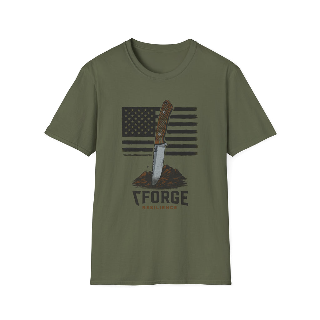 The 7Forge “Resilience” Tee stands for strength forged through challenge. Featuring a blade driven into the earth against a blacked-out American flag, this design represents grit, endurance, and pride in the work of your hands.
