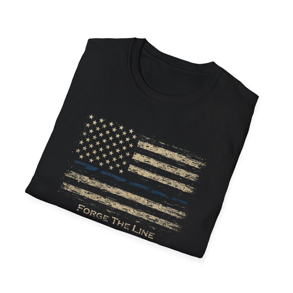 Front: Weathered U.S. flag graphic with Forge The Line inscription