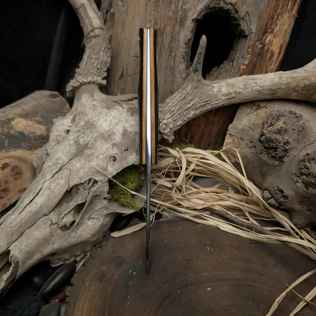 This knife was ground from 1/8 inch Procut high carbon steel. It features a blue Richlite handle with thick vintage canvas micarta liners over blue fiber liners. It also features natural canvas Micarta pins.