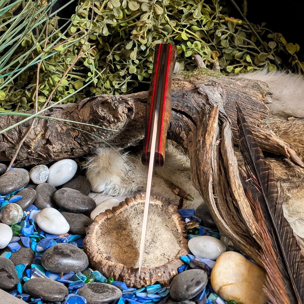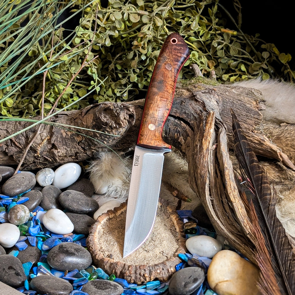 This knife was ground from 1/8 inch AEB-L Stainless Steel. It features a curly Koa handle with red pinstripes over black canvas liners. It also features mosaic pins.