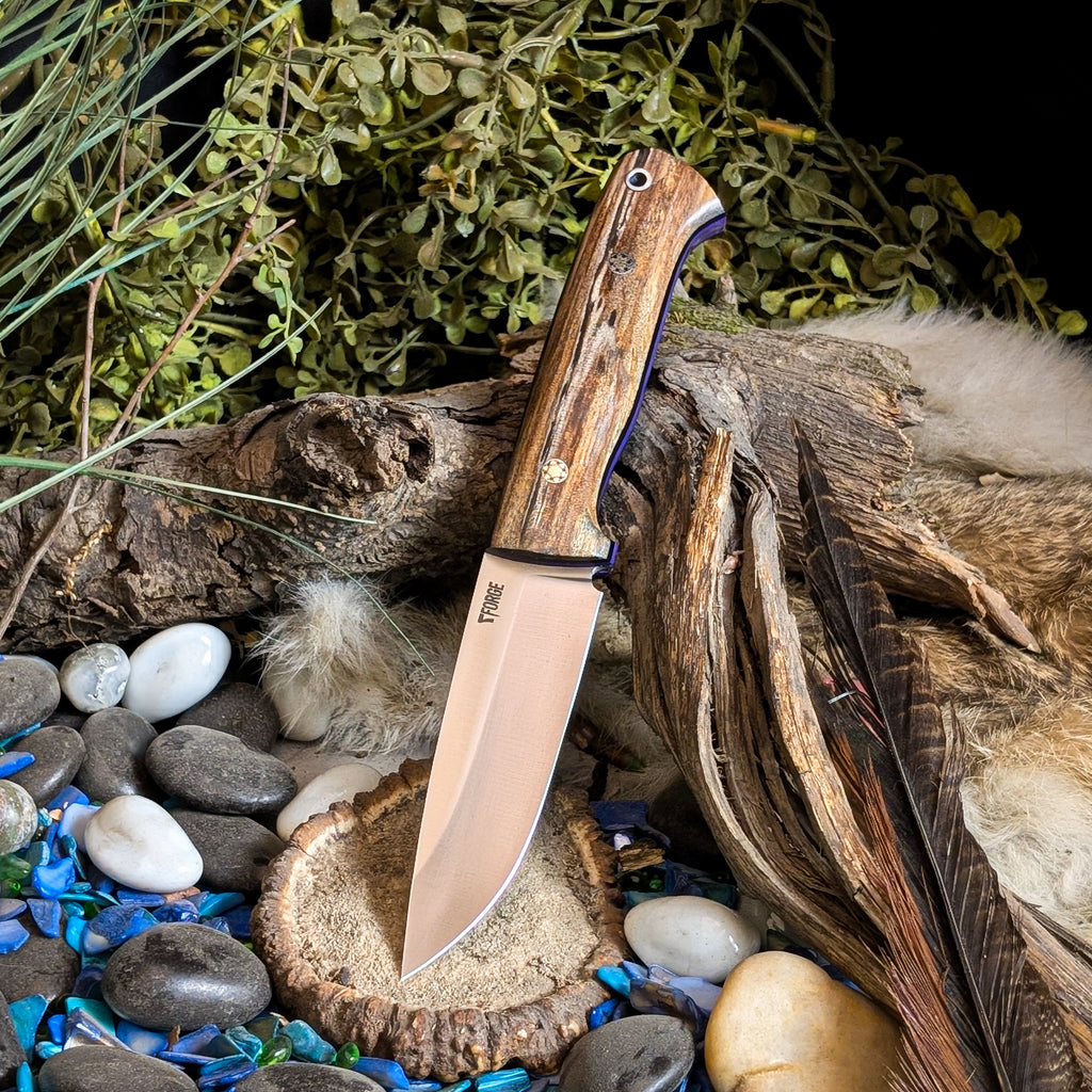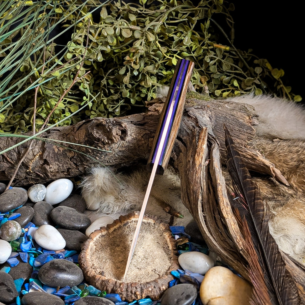This knife was ground from 1/8 inch AEB-L Stainless steel. It features a spalted Adler Handle with Black and purple liners and mosaic pins.