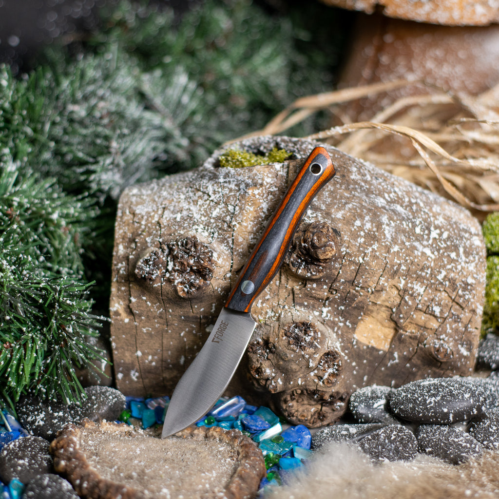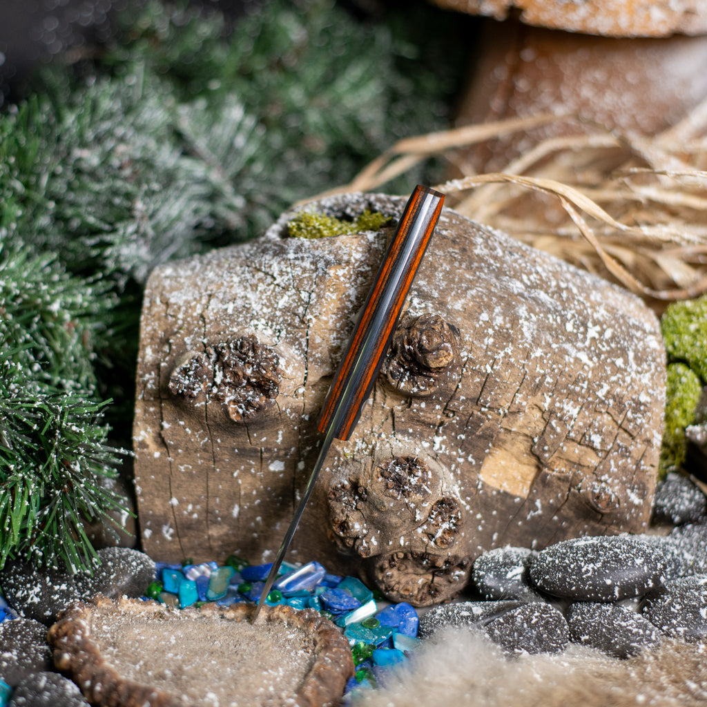 This knife was ground from 3/32nd AEB-L Stainless steel. It features a scarecrow Dymalux handle with aluminum pins.