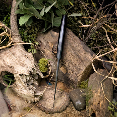This knife was forged from 8670 high carbon steel. It features a black Richlite handle with black liners and pins.