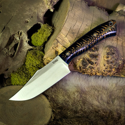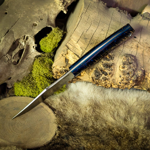 This knife was ground from Procut High Carbon steel. It features a blue pinecone handle with blue glow liners and mosaic pins.