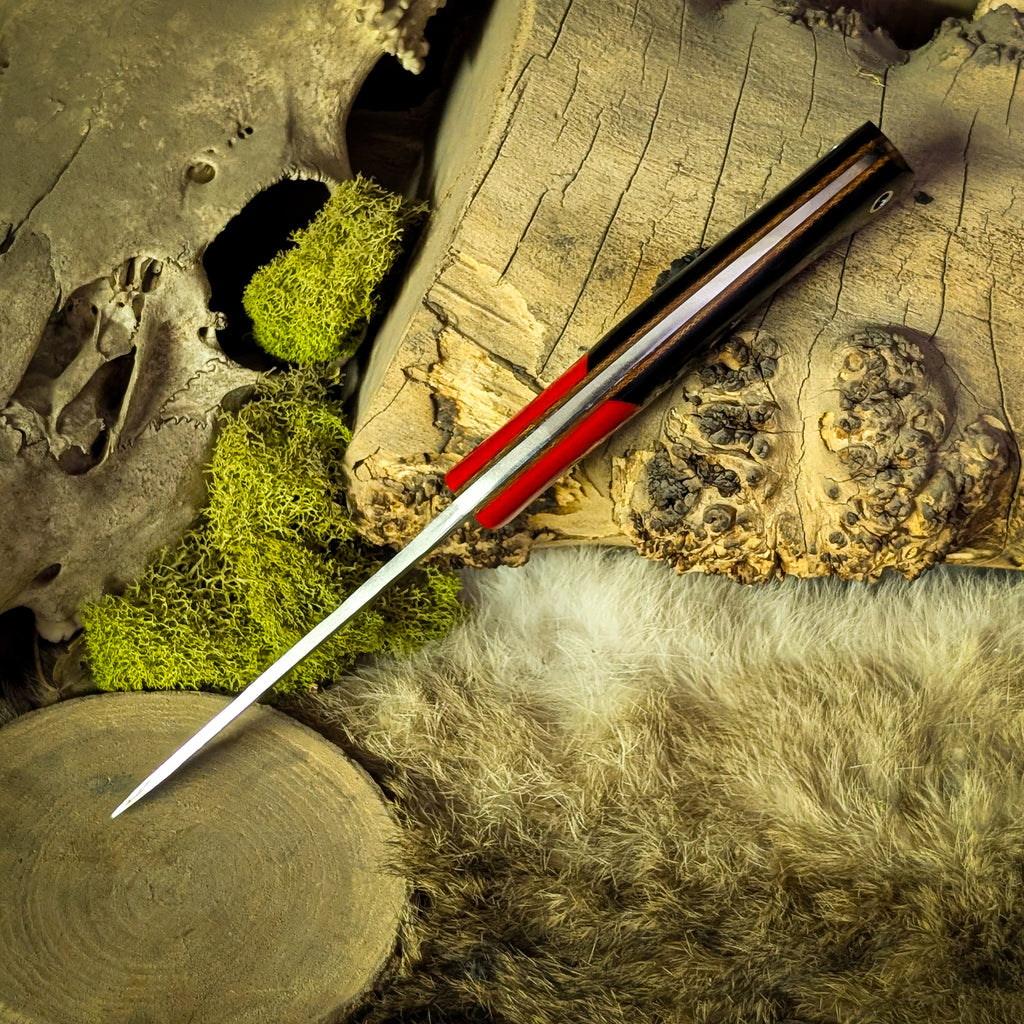 This knife was forged from 8670 high carbon steel. It features a black canvas micarta handle with a Red g10 bolster, natural canvas Micarta Liners and color swapped red and black pins.