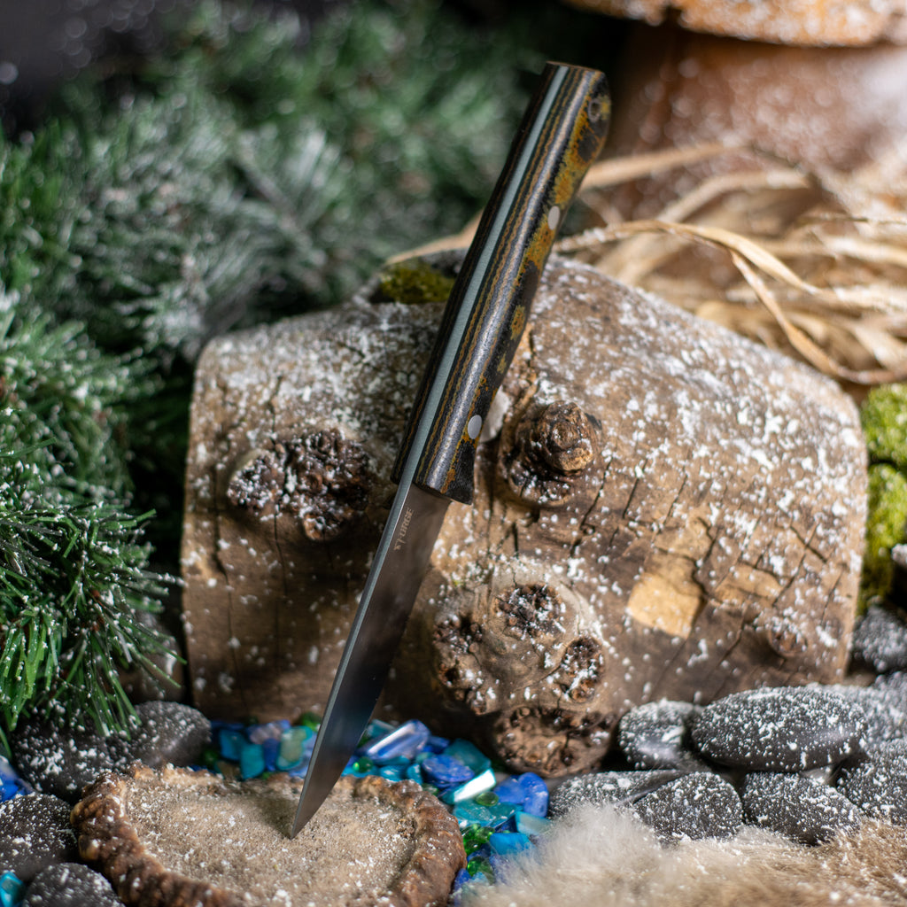 This knife was forged from 5160 high carbon steel. It features a camouflage Micarta handle with aluminum pins.