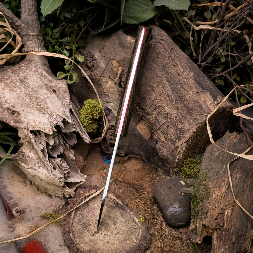 This knife was ground from 1/8 Procut high carbon steel. It features a green canvas micarta handle with red liners and brass mosaic pins.