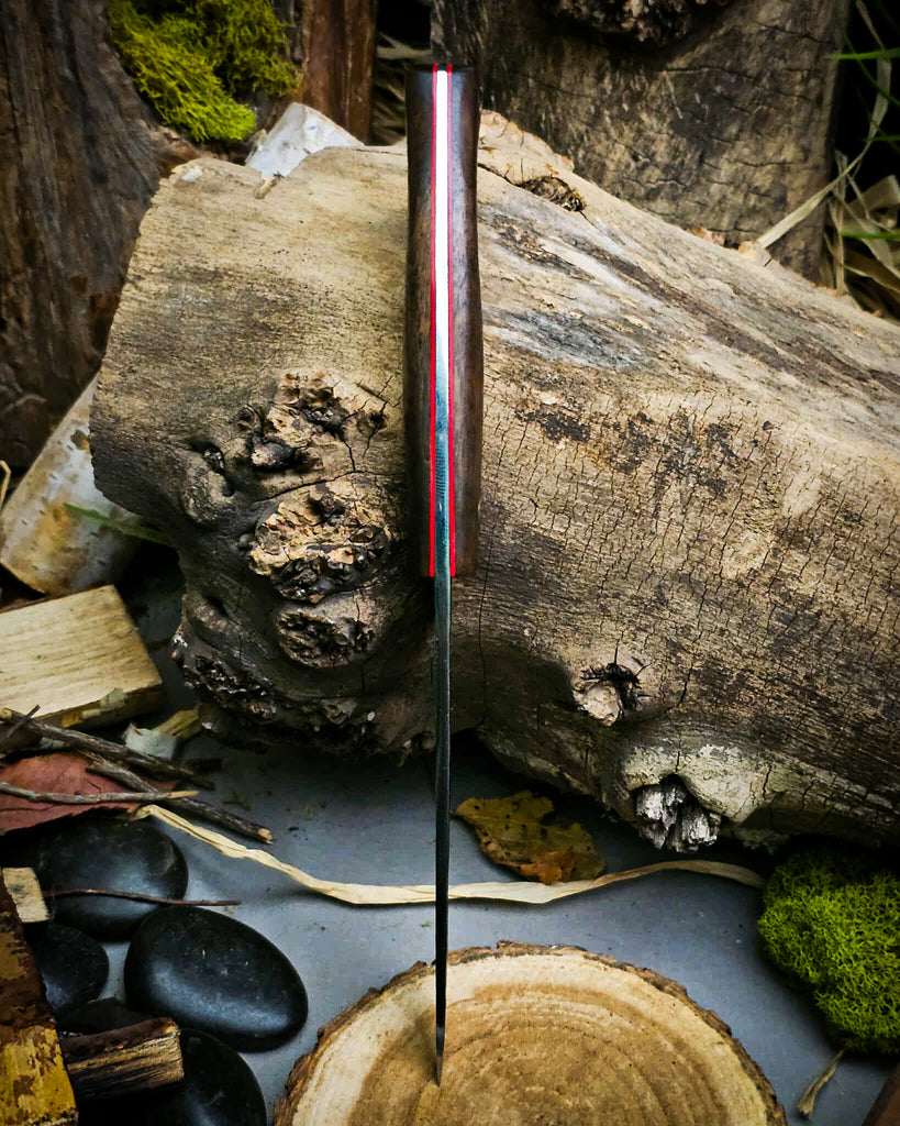 This knife was forged from 80crv-2 high carbon steel. It features a black walnut handle with red liners and brass pins.