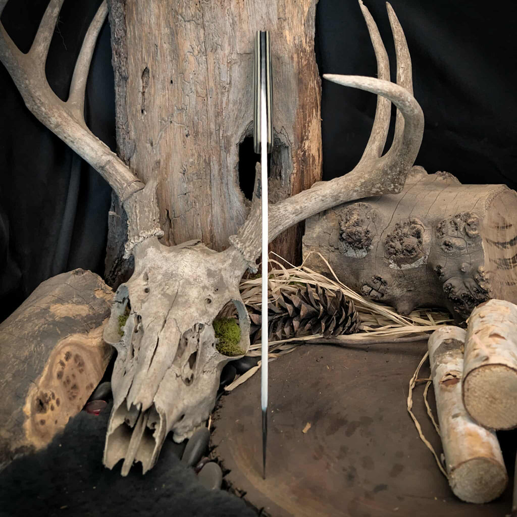 This chopper was forged from 8670 and features black and white paper micarta with black canvas liners and pins