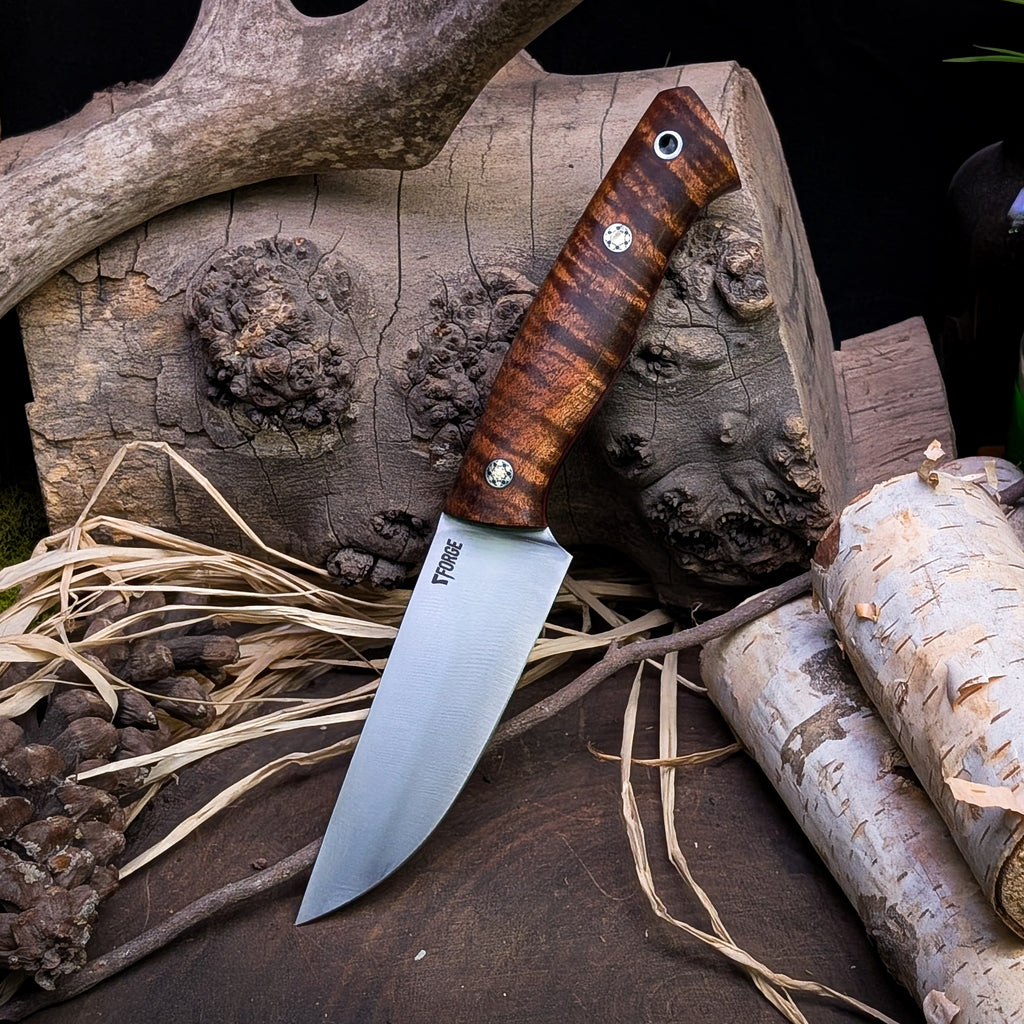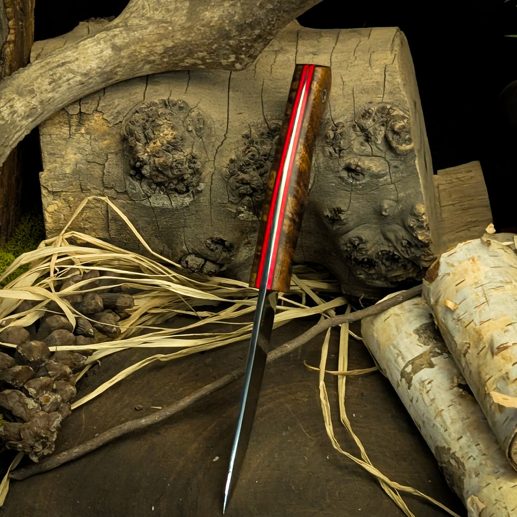 This knife was ground from 1/8 inch Procut high carbon steel. It features a curly Koa handle with black liners over red Glow in the dark liners. It also features stainless mosaic pins.