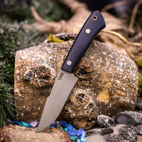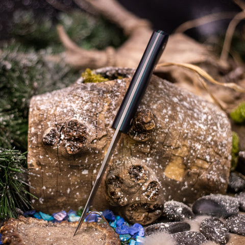 This knife was ground from 3/32nd Procut High Carbon Steel. It features a Blue Richlite handle with Teal glow in the dark liners and Aluminum Pins