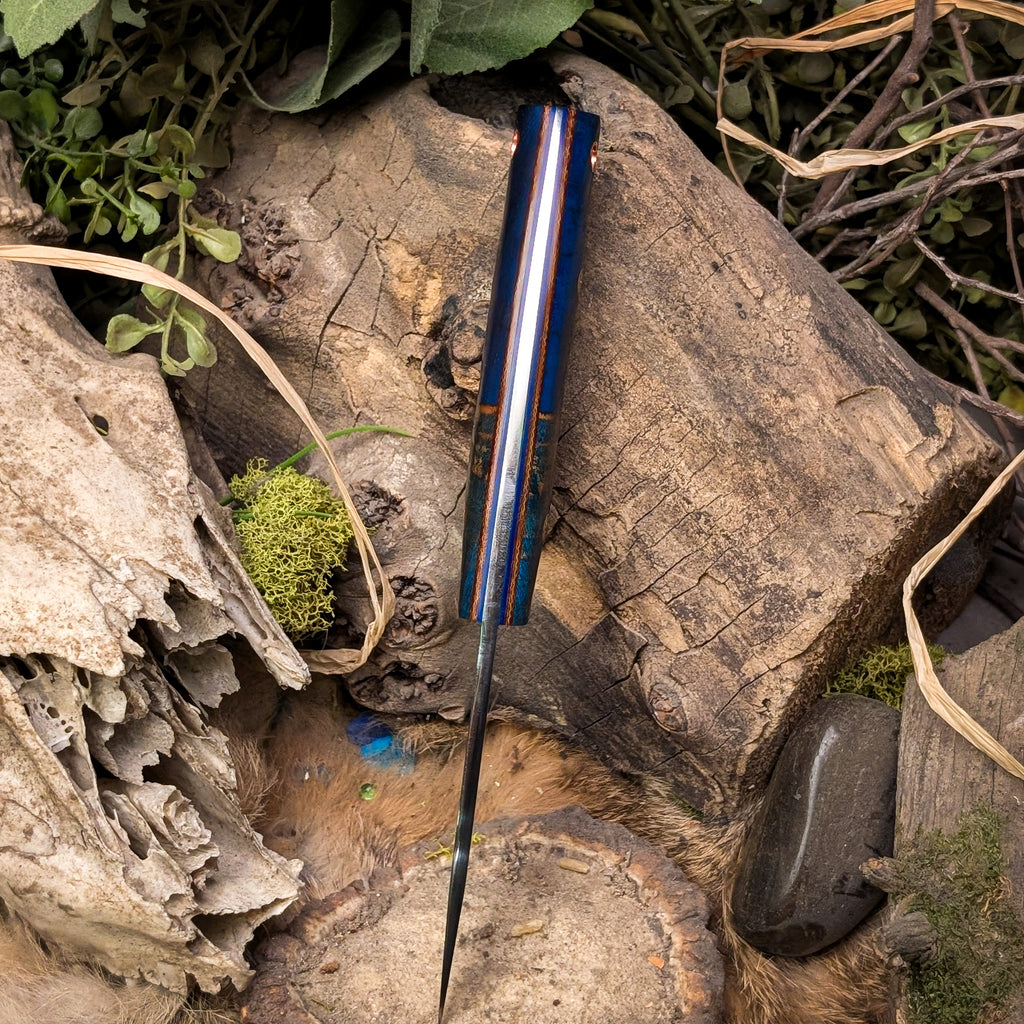 This knife was ground from 1/8 inch AEB-L Stainless steel. It features a blue curly maple handle with natural canvas micarta liners and copper mosaic pins.