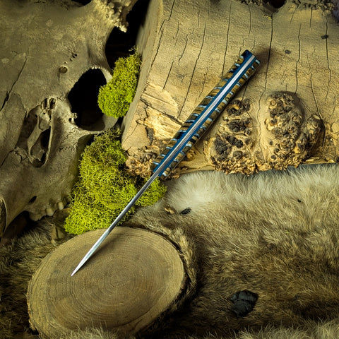 It features a mammoth molar handle with blue glow in the dark liners and a brass mosaic pin.