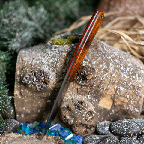 This praxis edc was ground from 1/8" Procut and features desert ironwood with red liners and brass pins