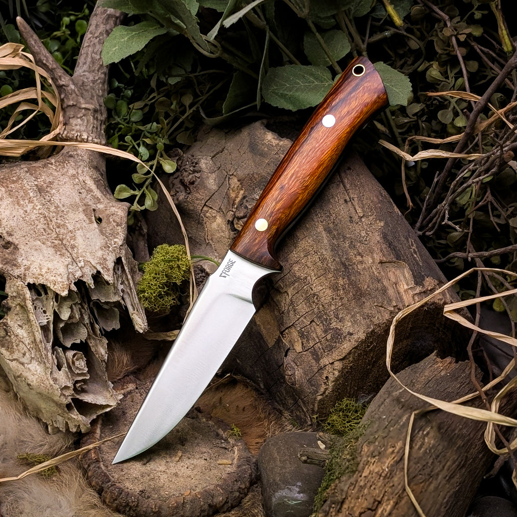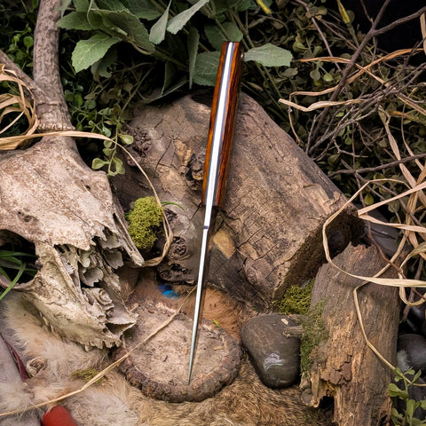 This knife was ground from 5/32nd 80crv-2 high carbon steel. It features a desert ironwood handle with black canvas micarta handle with brass pins.