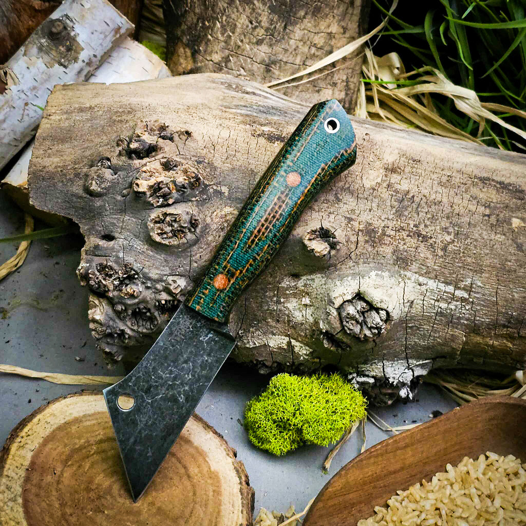 This knife was ground from 3/32nd Procut high carbon steel. It features a druid burlap handle with natural canvas micarta liners and pins.
