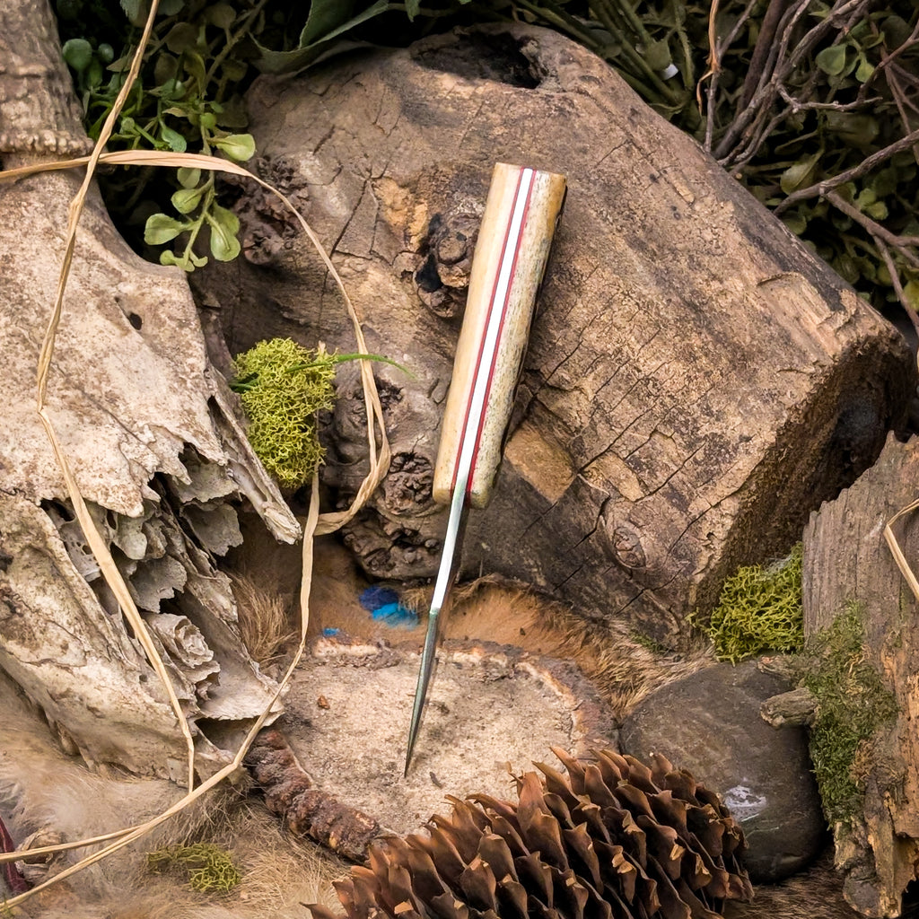 This siren was ground from 3/32nd Procut high carbon steel. It features a jigged bone handle with red liners and mosaic pins