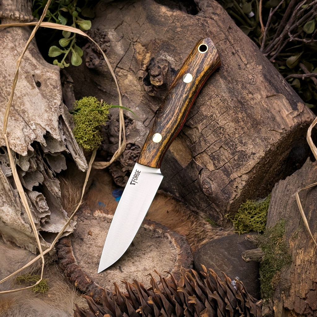 This knife was ground from 3/32nd AEB-L Stainless steel. It features a Bocote wood handle with red liners and brass pins
