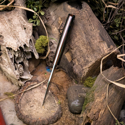 This knife was ground from 3/32nd Procut high carbon steel. It features a druid burlap micarta handle with natural canvas micarta liners and pins.