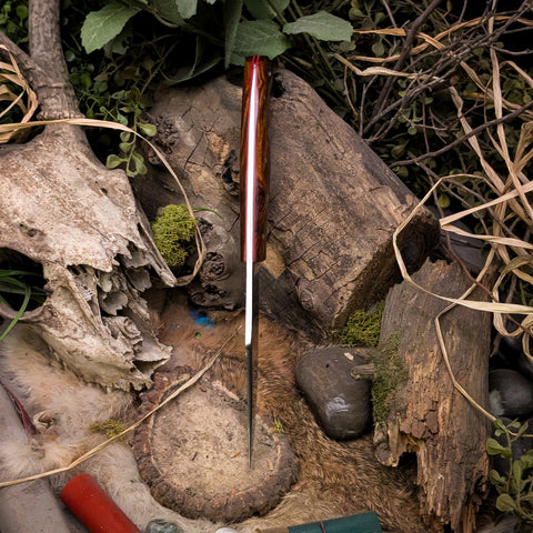 This knife was ground from 1/8 inch Procut. It features a desert ironwood handle with red liners and mosaic pins.  It also features 6 1/8 inch brass pins.