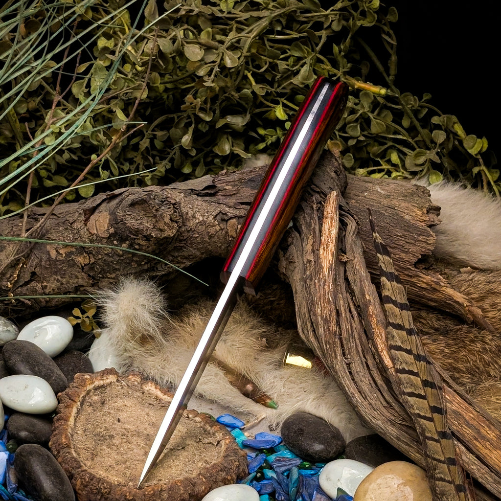 This knife was ground from 1/8 inch AEB-L Stainless steel. It features a desert ironwood handle with red pinstripes and thick black liners.